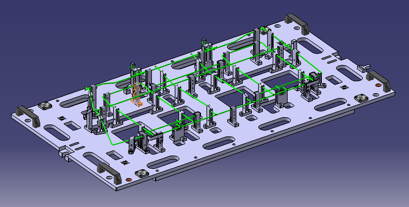 一臺焊機配一個XY工作平臺,平臺上有兩套夾具,兩套夾具可以是相同的,也可以是不同的,兩套夾具對應兩個操作工位,當XY平臺帶動其中一套夾具在焊接時,另一套夾具在工位上固定不動。例如夾具1在焊接時,工人可在夾具2上擺放工件,工人裝好件后按啟動按鈕,等待夾具1上工件焊完后,XY平臺先將夾具1送到工位1上,然后到工位2上取夾具2繼續焊接,此時工人可轉到工位1進行下料和上料的操作