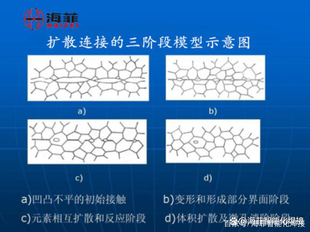 圖d、繼續隨著原子的擴散,就是達到了第三階段。第三階段是界面孔洞消失的階段。原子繼續得到擴散,那么界面與微孔最后消失,形成新的境界達到了一個冶金的結合。那么接頭的成分也趨于均勻,這就是擴散焊的基本過程。