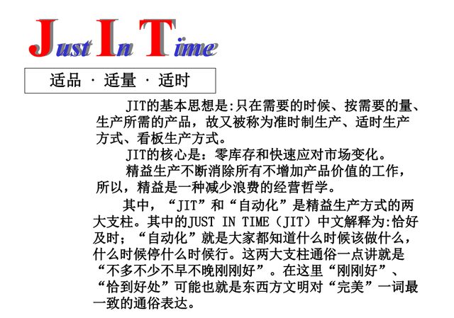 其中的 JUST IT TIME(JIT)中文解釋為:恰好及時;“自動化”就是大家都知道什么時候該做什么,什么時候停什 么時候行。這兩大支柱通俗一點講就是“不多不少不早不晚剛剛好”。 在這里“剛剛好”、“恰到好處”可能也就是東西方文明對“完美”一詞最一致的通俗表達。