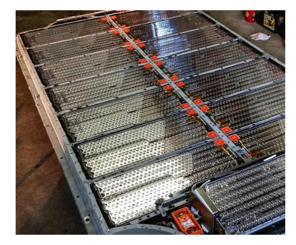 我們來瞧瞧特斯拉Model S的動(dòng)力電池板,特斯拉Model S的動(dòng)力電池板被分為8個(gè)區(qū)域,每個(gè)區(qū)域安裝2個(gè)電池模組,每個(gè)電池模組由超過444節(jié)松下18650鋰電池組成,整個(gè)電池板約有7104 節(jié)鋰電池,電池模組內(nèi)部的電芯通過銅質(zhì)軟連接器連接,16個(gè)電池模組再由中間的主線串聯(lián)。