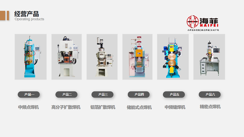 無錫海菲焊接設備有限公司是20年專注于儲能點焊機等電阻焊機的研發、定制和生產,具備金屬連接智能化生產線和物聯網一站式服務能力。主要應用于新能源汽車、汽車零部件、5G通訊行業、低壓電器行業、家電五金行業等。可根據客戶需求,研發定制各種需求的電阻焊機和智能化焊接設備裝配焊接生產線、流水線,為企業轉型升級提供合適的智能化整體解決方案,助力企業快速實現轉型升級,幫助企業提升核心競爭力。如果您對我們的智能化焊接設備和生產流水線感興趣,請聯系我們:183-0616-1990。
