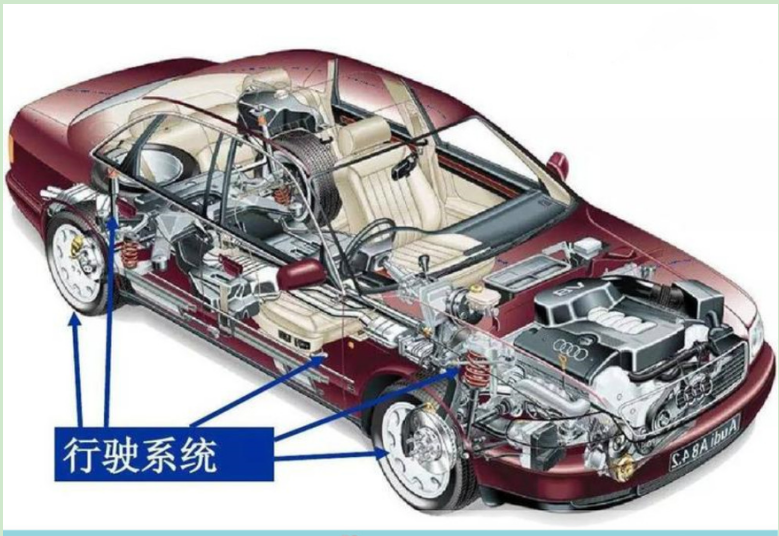 ②汽車底盤的行駛系統(tǒng)別稱汽車底盤驅(qū)動(dòng)系統(tǒng),汽車底盤驅(qū)動(dòng)系統(tǒng)由汽車車架、車橋、車輪和懸架等組成。