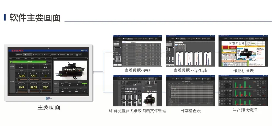●可以管理項目為焊接電流、焊接電壓、通電時間、加以壓力、冷卻水溫度、輸入熱量、防止打點泄露、Tip更換/清潔周期、管理數據上下限、管理生產量